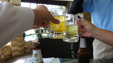 スタート前、シンハビールに氷を入れたジョッキで、乾杯。